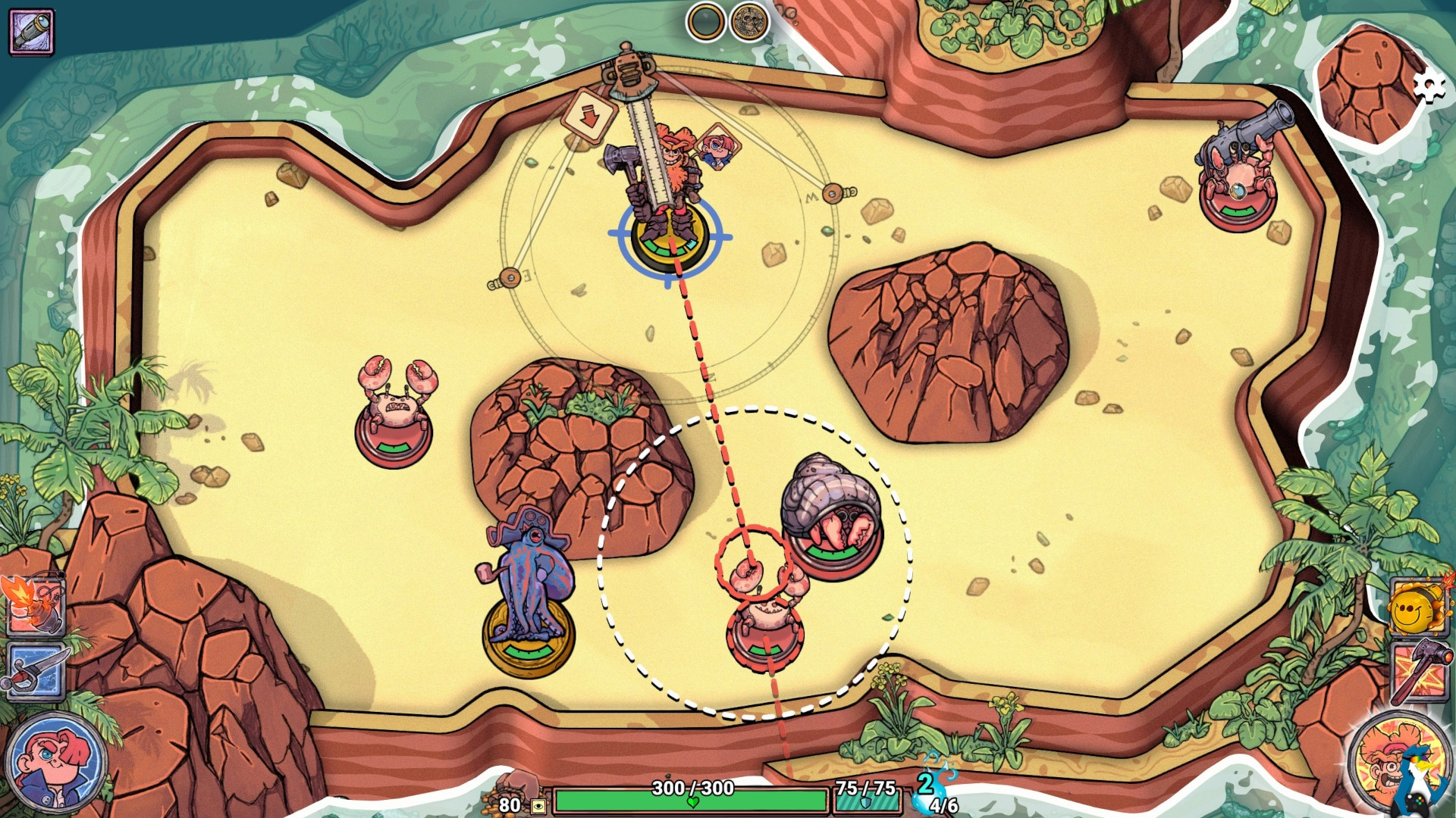 У каждого героя — свой набор умений, и одновременно на поле находится лишь один. До выстрела можно в любой момент переключаться между ними, так что всё зависит от тебя: выжимай максимум из каждого броска и используй способности по полной. Игра не наказывает зверской сложностью, но бросает серьёзный вызов, когда на арене собирается пёстрый набор врагов со своими трюками. Приходится постоянно думать на ход вперёд: где окажешься после выстрела и какие неприятности принесут перемещения противников.