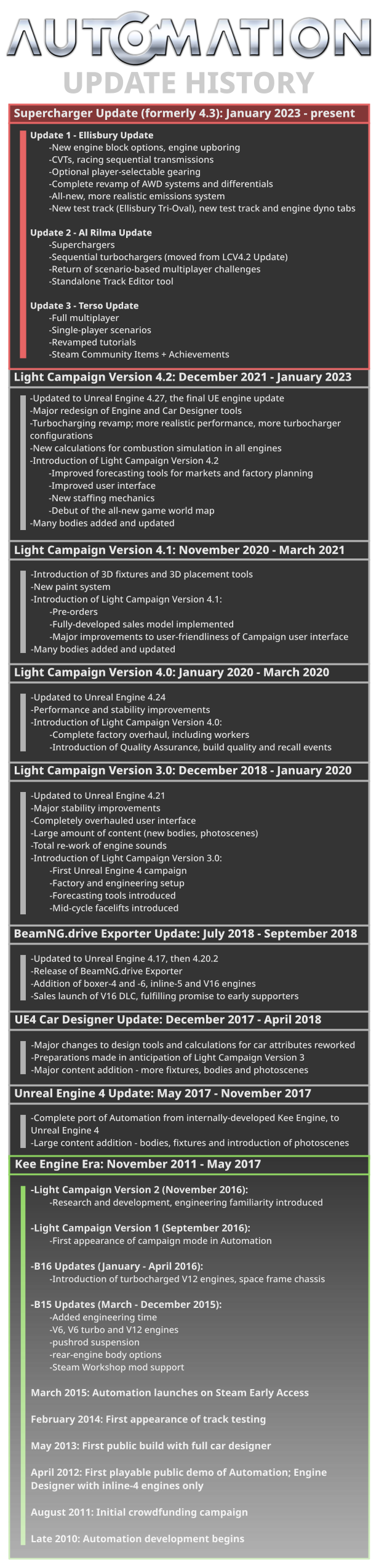 Automation - симулятор проектирования автомобилей, в котором представлены транспортные средства и технологии с 1946 по 2020 год. Используйте уникальные инструменты проектирования двигателей и автомобилей, чтобы создать свой идеальный автомобиль, а затем постройте и продайте его жаждущей автомобилей публике в режиме кампании. За один клик экспортируйте свои творения в BeamNG.drive (продается отдельно) с помощью соответсвующего инструмента и поделитесь ими с другими, или лично испытайте ваши автомобили на дороге и треке.