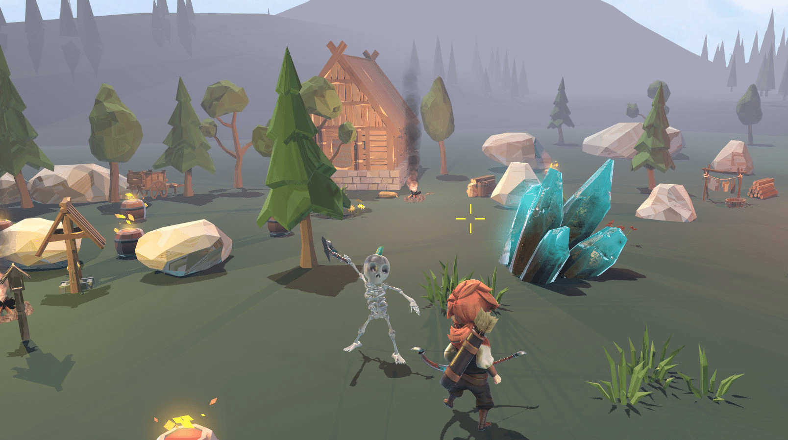 Цельтесь в скелетов, удерживая левую кнопку мыши, и стреляйте. Ваша задача не дать скелетам добраться до кристалла.