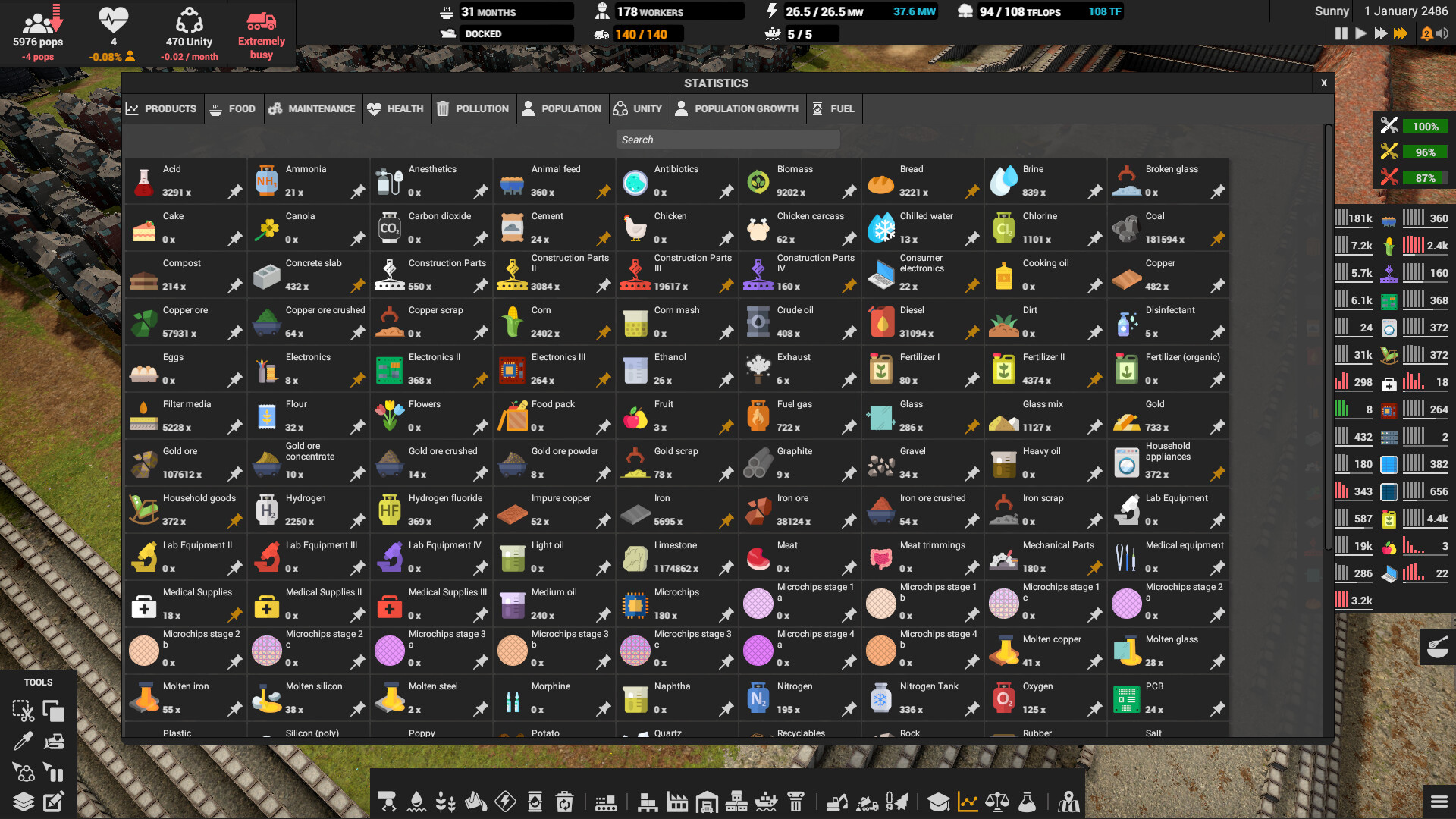 Вначале всё просто - выплавка металлов, производство бетона, стройматериалов, пищевых продуктов. Но вскоре дело доходит до нефтепереработки, электроники, солнечных панелей, вычислительных центров и даже ракет. Можно изучить и использовать более 150 различных товаров!