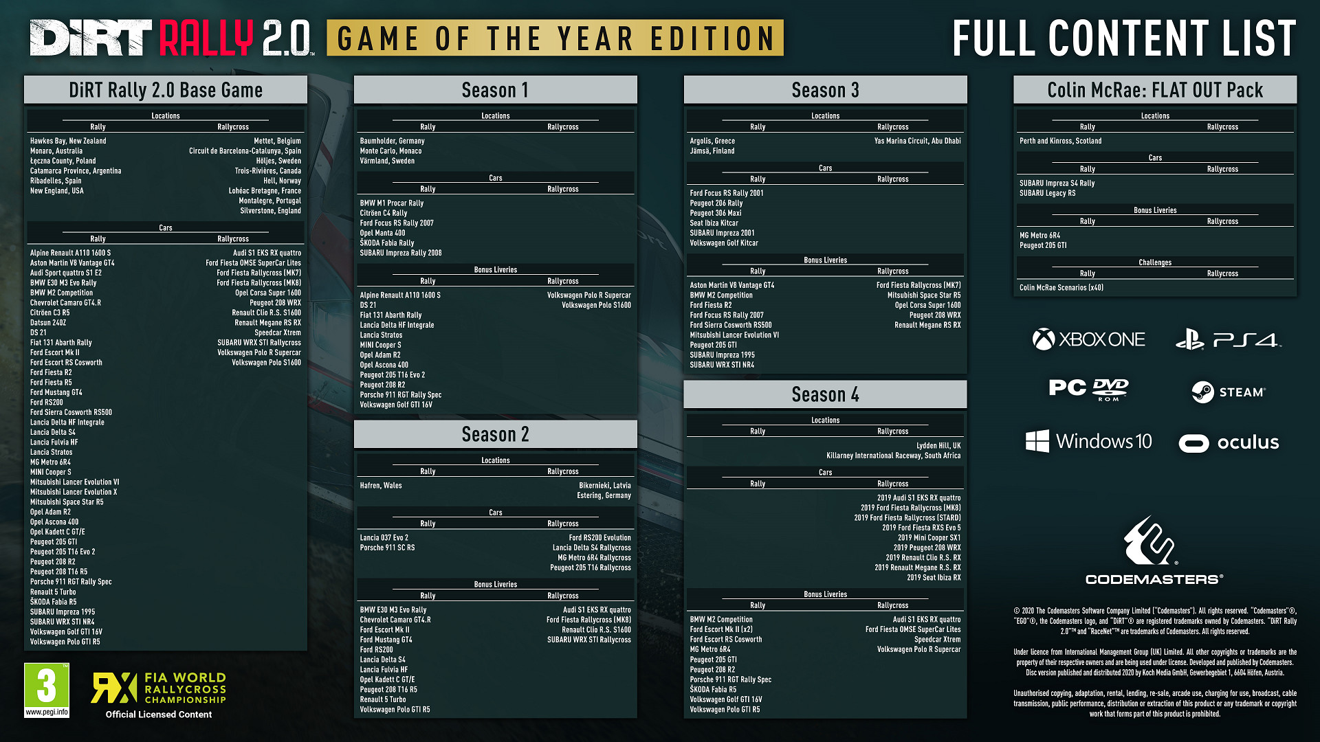 • ОФИЦИАЛЬНАЯ ИГРА ЧЕМПИОНАТА МИРА ПО РАЛЛИ-КРОССУ FIA. Гоняйте в Барселоне, Монталегри, Мете, Лоэаке в Бретани, Труа-Ривьере, Аду, Хольесе и Сильверстоуне в различных сериях игры.