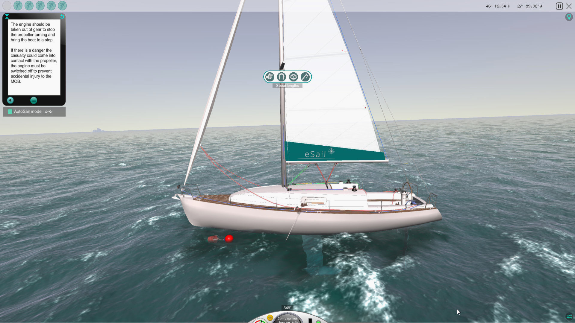 ПРЕДУПРЕЖДЕНИЕ. eSail "человек за бортом" не заменяет тренировки с квалифицированным инструктором. Спасение человека за бортом ДОЛЖНО практиковаться на реальной лодке с квалифицированным инструктором. Никогда не выходите на парусную лодку, если вы не прошли соответствующую подготовку и не получили квалификацию. Парусный спорт в реальном мире может быть физически и психически тяжелым. Эти аспекты невозможно воспроизвести в симуляторе. Кроме того, физика в любом симуляторе не всегда может повторить реальную жизнь или конкретную лодку.