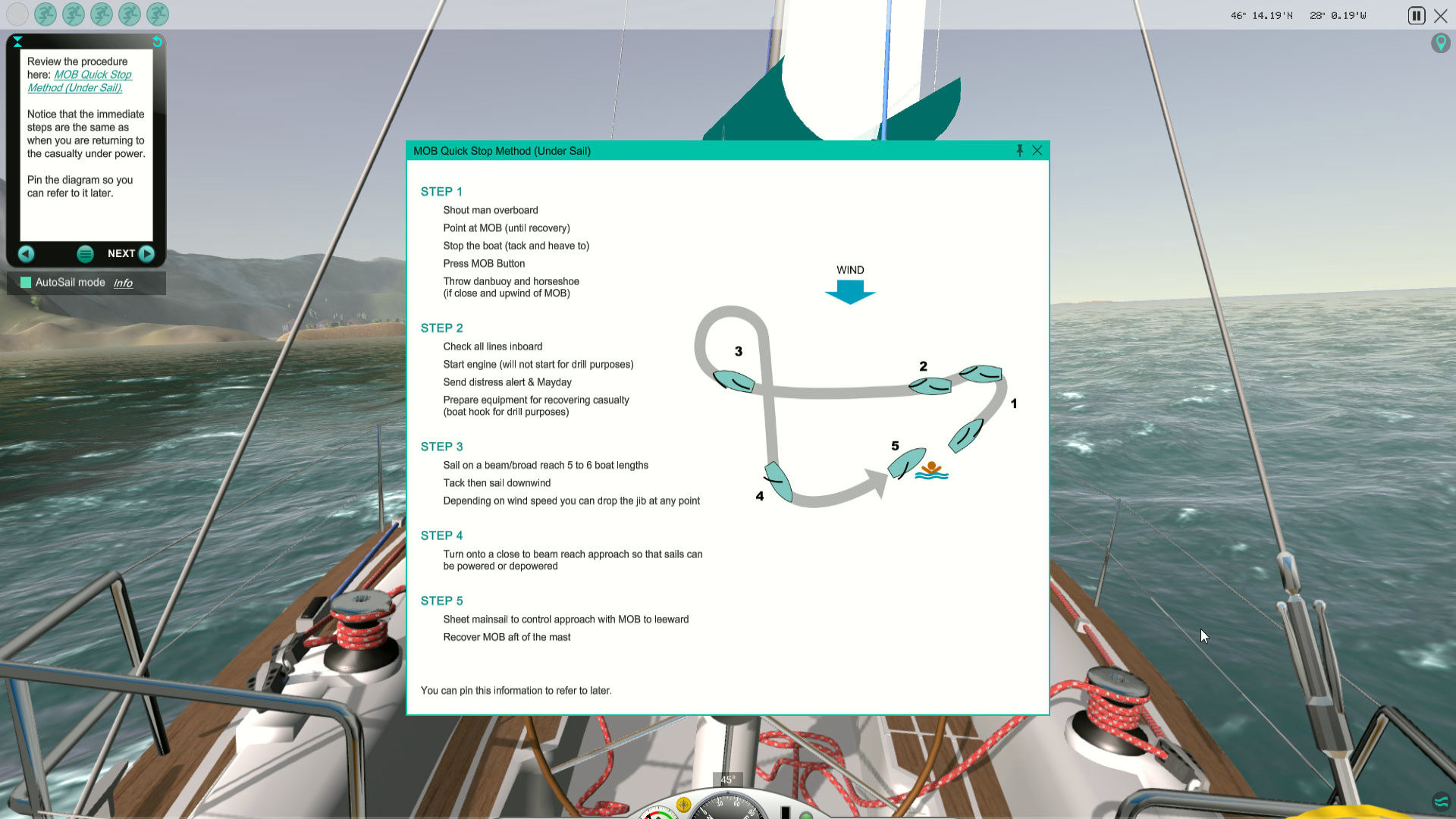 - Метод быстрой остановки под парусом. Этот урок начинается с ухода в дрейф, но попытка запустить двигатель провалится, и вам придется использовать парус. Вы научитесь повороту восьмеркой с последующей остановкой и подъемом потерпевшего на борт.