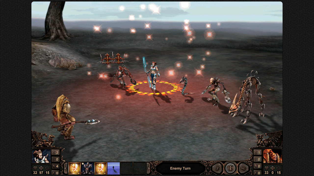 - Полностью трехмерный пошаговый бой с неограниченным множеством тактических решений.