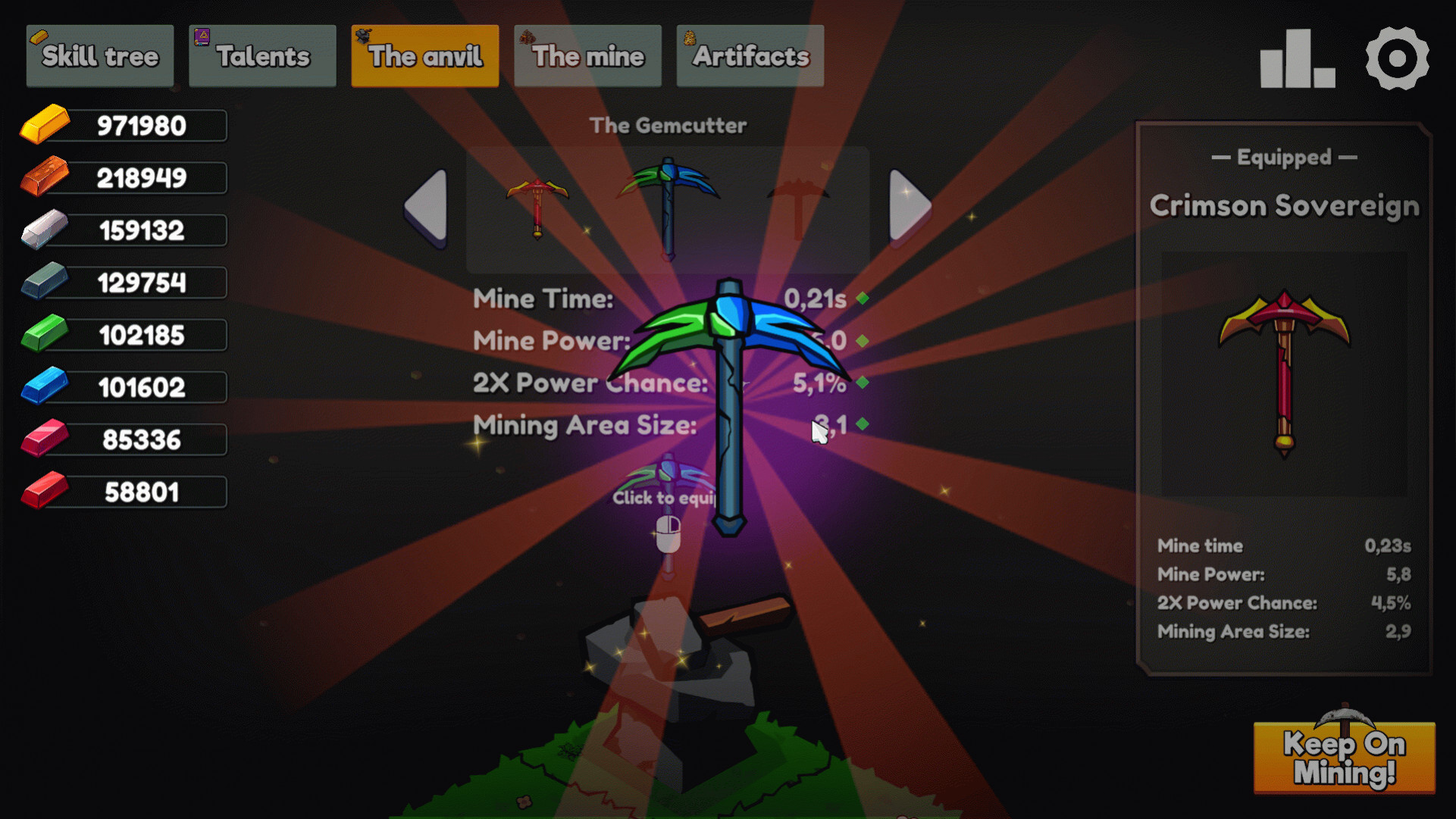 После открытия шахта будет автоматически добывать камни и мгновенно создавать слитки. Шахта — это элемент автоигры в Keep on Mining!