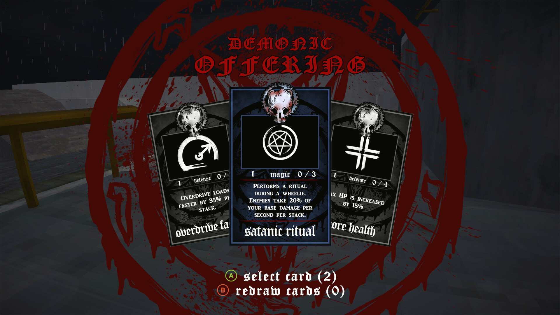 Демонические дары приходят в виде карт. Соберите свою колоду, выбирая подходящие карты. Разблокируйте новые карты для последующих прохождений игры, чтобы быть готовым к ужасам, которые может предложить Motördoom.