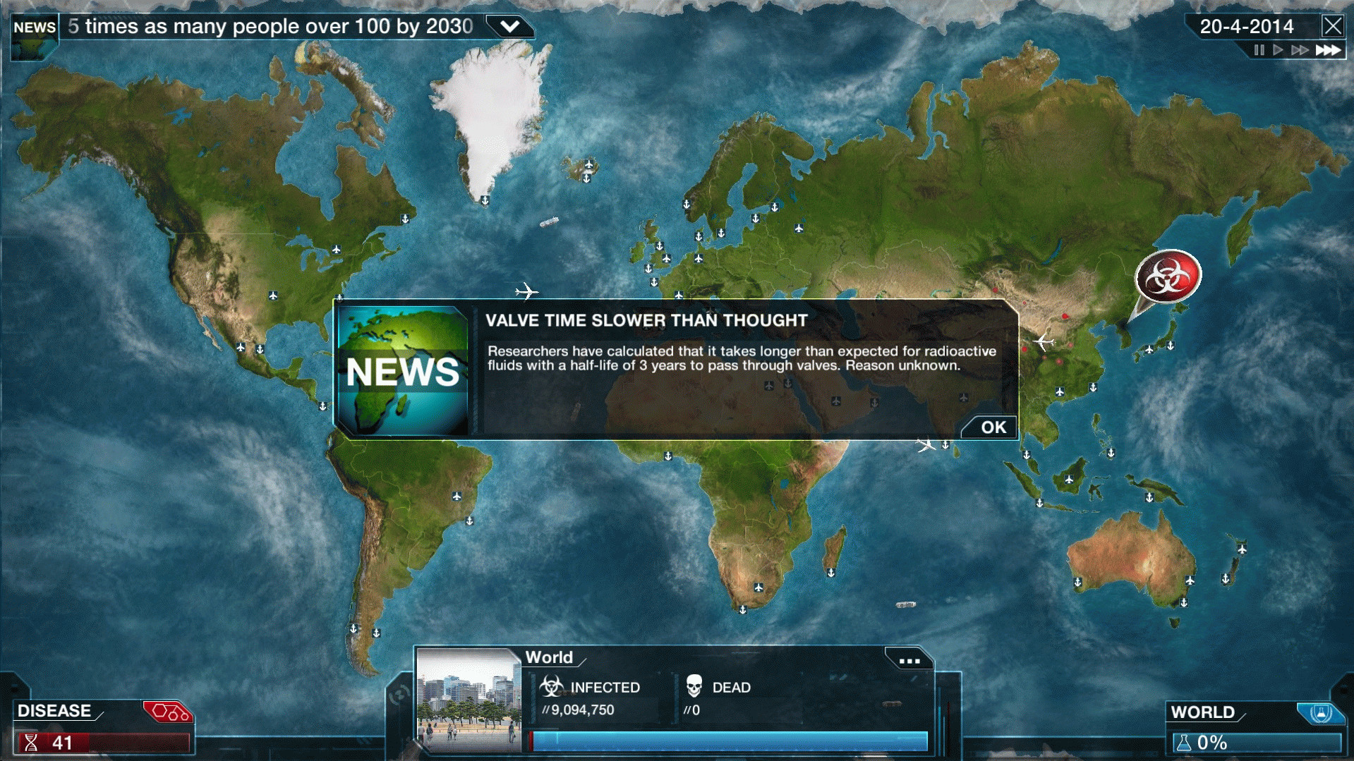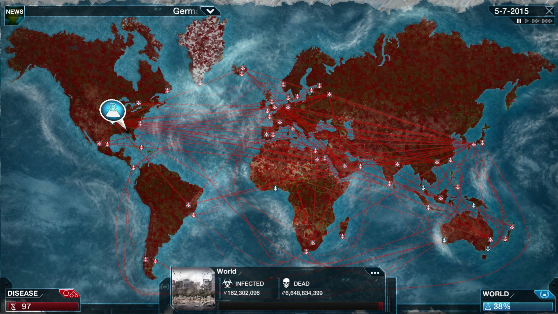 - Статистика заболеваний — данные, графики, возможность наблюдать за заражением и уровнями смертности, отслеживать реакцию правительства и попытки излечения, а также оценить успех (или неуспех) болезни, изучив повтор игры.