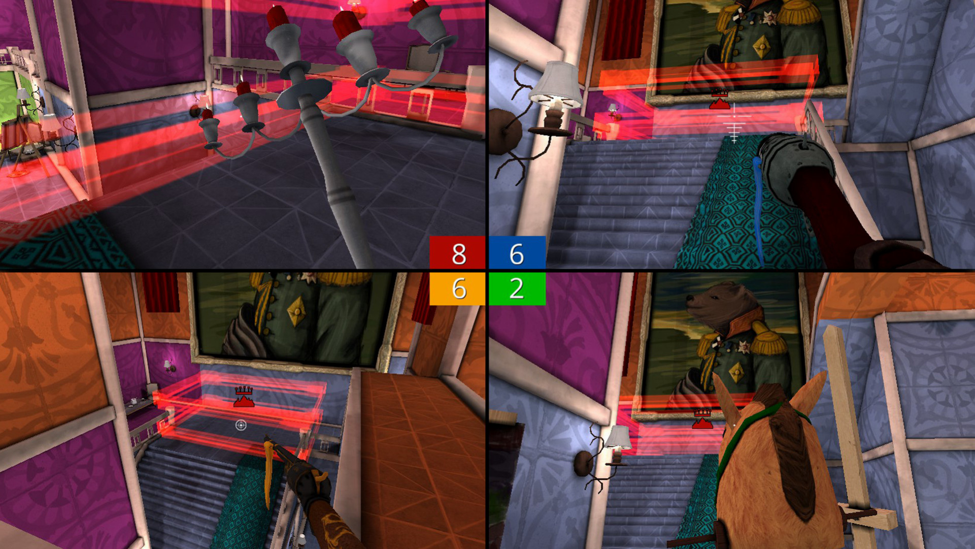 Как и в лучших соревновательных стрелялках, вам предстоит побегать по 11-ти картам с воздуховодами и трамплинами, найти цель и должным образом уничтожить её. На каждой карте есть цветные зоны и множество ориентиров: статуи, картины и мебель, чтобы вы могли быстро найти невидимого противника.